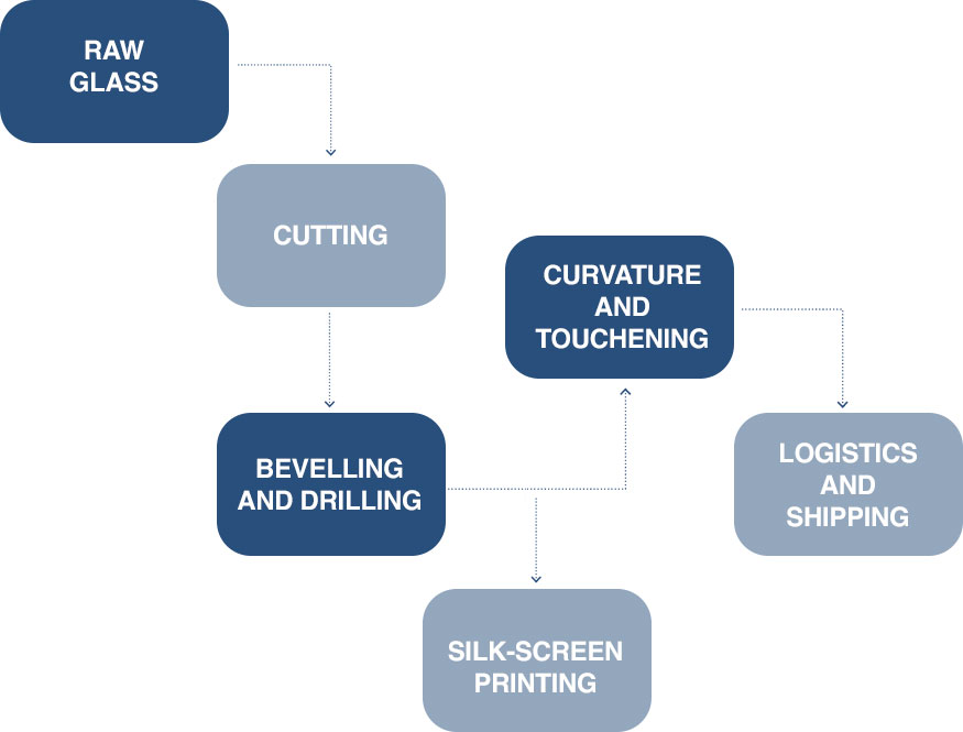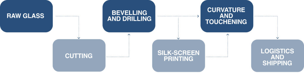 Our corporate industrial process starts by purchasing “glass,” the raw material, classified and divided by thickness and colour.