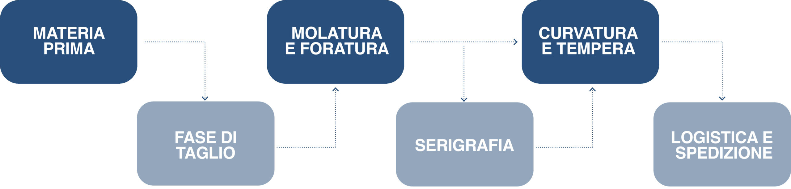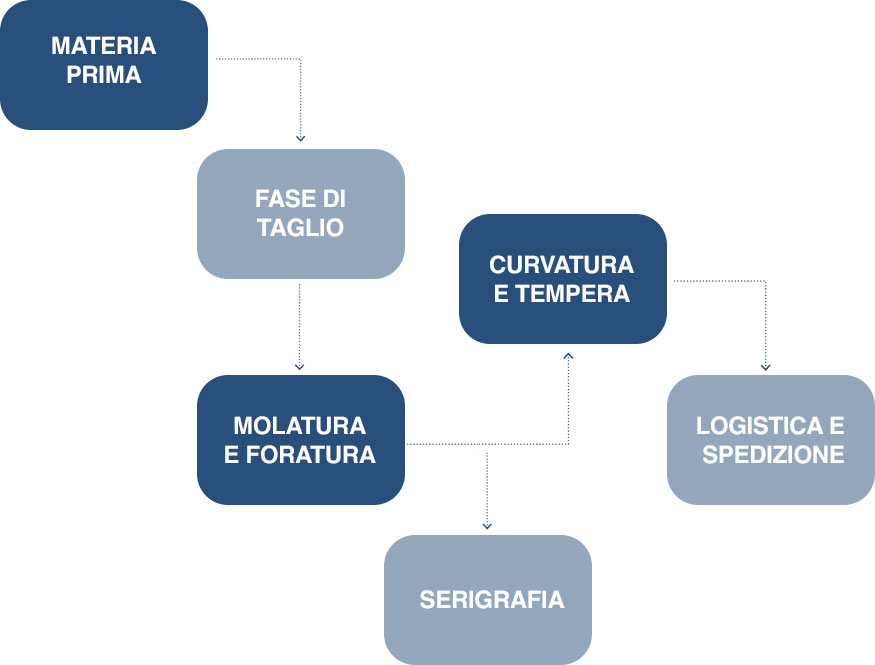 Il processo industriale, oggetto della nostra realtà, si sviluppa dall’acquisizione della materia prima “vetro”, classificata e suddivisa per spessore e colore.